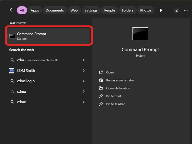 - Bước 1: Nhấn phím Windows, nhập từ khóa cmd vào thanh tìm kiếm và nhấn Enter để mở Command Prompt.