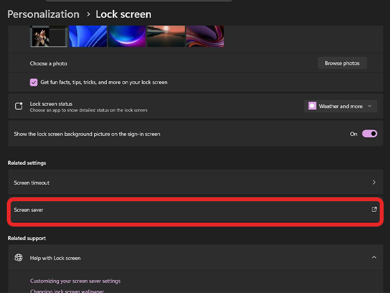- Bước 1: Vào Settings => Personalization => Lock screen và chọn Screen saver settings.
