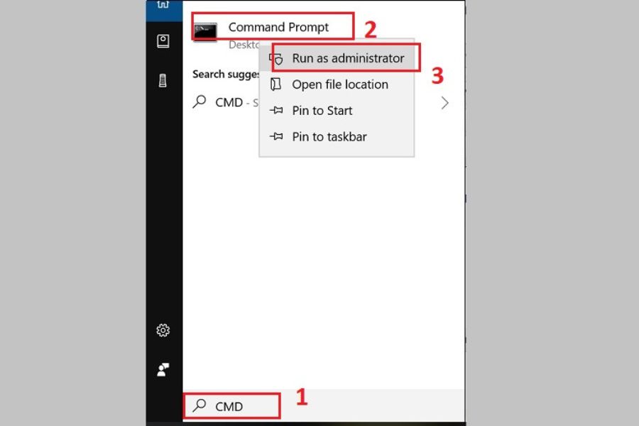 - Bước 1: Đầu tiên các bạn nhấn tổ hợp phím Windows + S, lúc này màn hình máy tính sẽ hiện ra mục tìm kiếm trên máy tính. Các bạn bấm CMD rồi chọn vào ứng dụng Command Prompt và chọn tiếp vào mục Run as admin.
