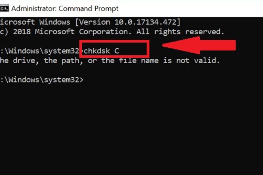 - Bước 2: Lúc này màn hình sẽ xuất hiện bảng Administrator bạn hãy nhập câu lệnh "chkdsk C:" rồi chọn Enter.
