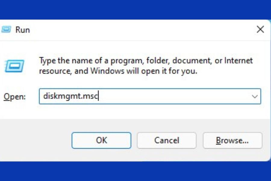 - Bước 1: Đầu tiên các bạn cũng chọn tổ hợp phím Windows + S rồi sau đó tiến hành nhập lệnh diskmgmt.msc. rồi chọn tiếp tục vào mục OK.