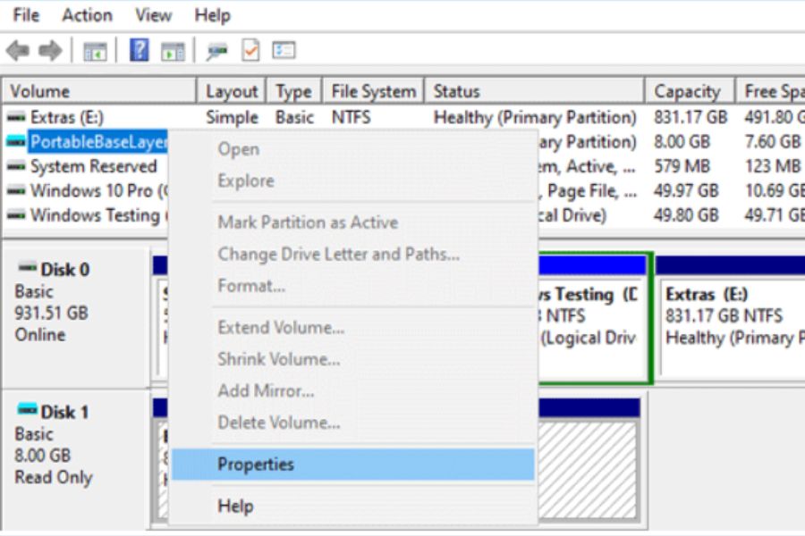 - Bước 2: Lúc này cửa sổ của phần mềm Disk Management sẽ xuất hiện, bạn hãy chọn vào ổ cứng mà bạn muốn kiểm tra, nhấp chuột trái rồi chọn mục "Properties”.