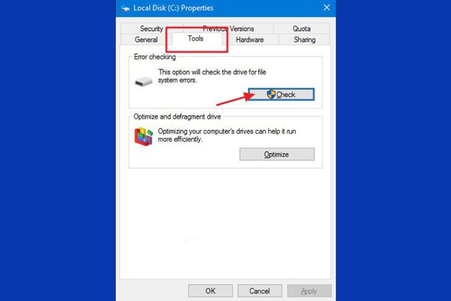 - Bước 3: Lúc này trên màn hình sẽ xuất hiện một cửa sổ nhỏ khác, bạn hãy mở sang trang tools và chọn mục check now để tiến hành kiểm tra ổ cứng bạn nhé.