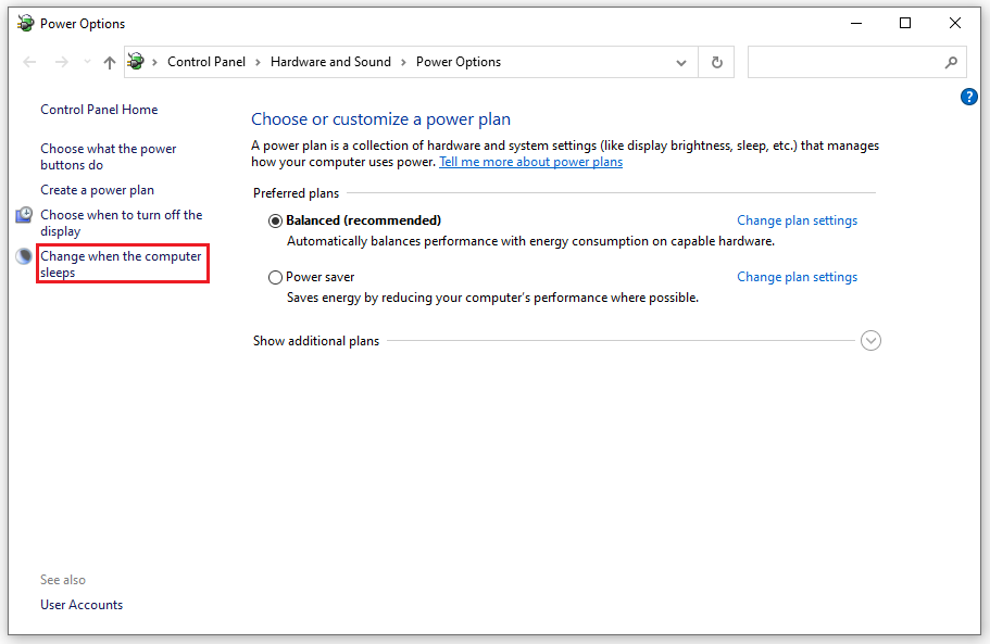 - Bước 3: Nhấn vào dòng chữ Change when the computer sleeps ở cột danh mục nằm phía bên trái của cửa sổ mới.