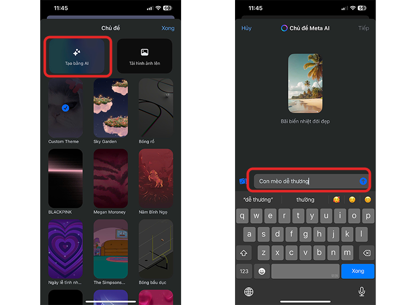 Tính năng “Tạo bằng AI” mang đến giải pháp tạo hình nền độc đáo, giúp bạn dễ dàng sở hữu giao diện chat mang đậm dấu ấn cá nhân. Chỉ với một câu lệnh mô tả, hệ thống sẽ tự động thiết kế hình ảnh theo ý tưởng mong muốn. Đây là lựa chọn lý tưởng để thể hiện phong cách riêng và đảm bảo không bị trùng lặp với người khác.