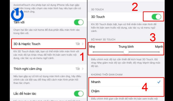 Bước 3: Sau đó bạn hãy chọn vào 3D Touch & Haptic Touch → Gạt nút qua phải để bật 3D Touch và bạn có thể điều chỉnh được độ nhạy tại đây.