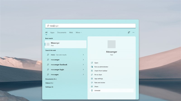 Sẽ có rất nhiều ứng dụng không thể Native từ Windows 10 lên Windows 11, bạn hãy xóa bỏ ứng dụng cũ đi. Vào mục kiếm tìm trên Taskbar > Tìm tên ứng dụng và chọn Uninstall. Đặc biệt là Messenger, Zalo và Facebook.
