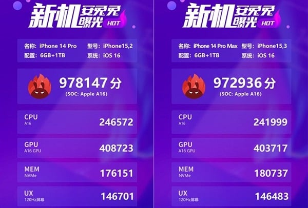 Theo các nguồn tin từ AnTuTu, điểm số của iPhone 14 series gây bất ngờ với số điểm là 950.000. So sánh với điểm trung bình của iPhone 13 Pro Max thì iPhone 14 có điểm số cao hơn 14% và chỉ xếp sau một số ít máy tính bảng như iPad Pro và iPad Air 5.