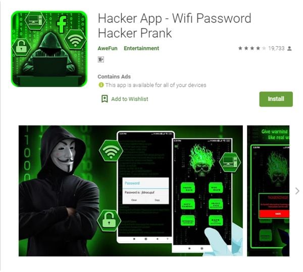 Sau khi tải ứng dụng Hacker Prank về, bạn có thể tự chọn mạng Wifi gần nhất và sau đó chọn chia sẻ kết nối Wifi hoặc điểm phát sóng. WiFi Password Hacker Prank sau đó được khởi chạy ngay lập tức. Sau khi nhấn nút cài đặt, bạn có thể chọn WPA, WPA2, WEP, v.v.