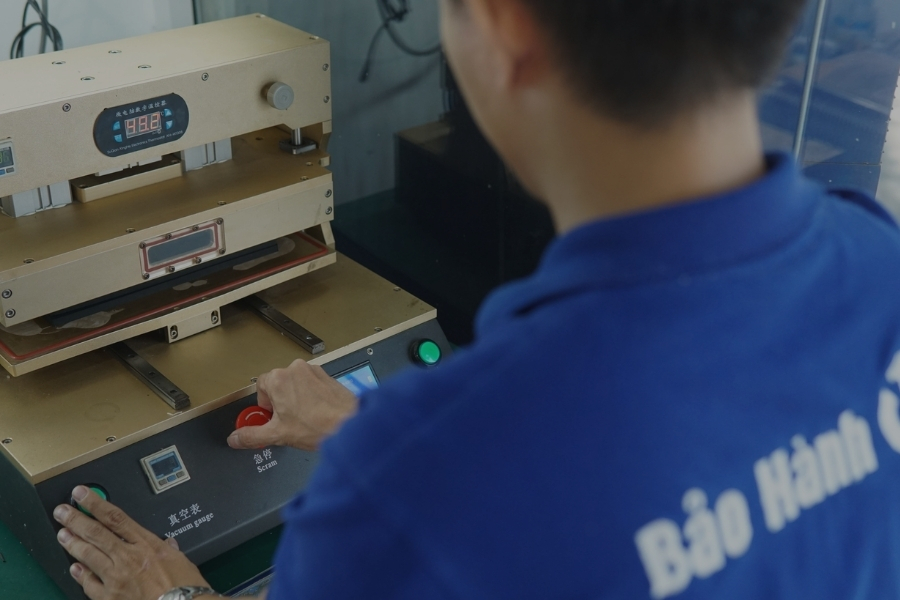 Bước 3: Vệ sinh màn hình để loại bỏ keo, bụi bẩn và phủ keo OCA. Sau đó đặt kính mới vào và ép bằng máy chân không để đảm bảo không có bọt khí.