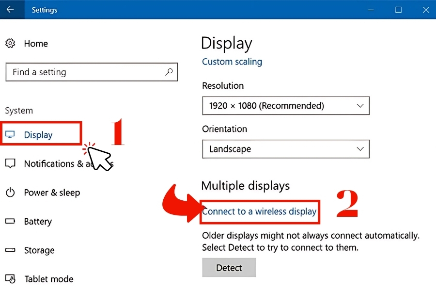 Bước 2: Trên laptop, bạn hãy mở Settings > nhấp chuột vào mục Display > tiếp tục nhấn vào Connect to a wireless display.
