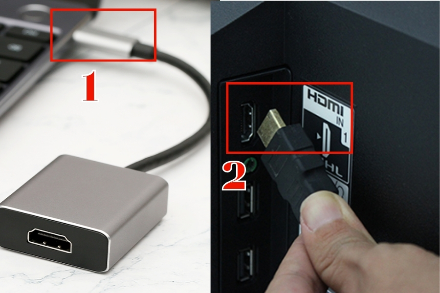 Bước 1: Bạn cần cắm đầu cáp USB-C vào laptop và đầu HDMI ở phía sau tivi.