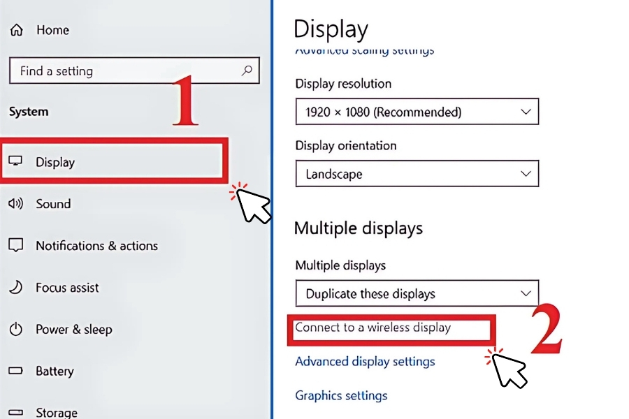 Bước 2: Trên laptop, bạn hãy chọn mục Display trong phần Settings > tiếp tục chọn Connect to a wireless display > chọn đúng tivi bạn muốn kết nối từ danh sách thiết bị đã quét được > nhập mật khẩu nếu tivi yêu cầu (mật khẩu sẽ hiện sẵn trên tivi).