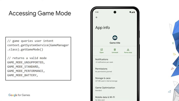 Đối với chế độ trò chơi API (Android 12's Game Mode APIs), Android 12 sẽ cho phép các nhà phát triển điều chỉnh hợp lý lại các cấu hình khác nhau do người chơi lựa chọn, chẳng hạn như 'thời lượng pin tốt hơn khi chơi liên tục hoặc chế độ hiệu suất để có được tốc độ khung hình cao nhất".