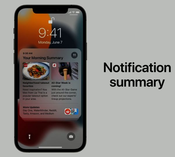 IOS 15 giúp tóm tắt thông báo được cá nhân hóa hoàn toàn, nó tập hợp các thông báo không khẩn cấp lại với nhau để gửi vào thời điểm thích hợp hơn. Các thông báo trong màn hình tóm tắt được sắp xếp theo thứ tự ưu tiên bằng cách sử dụng trí thông minh trên thiết bị để phân tích các tương tác của người dùng với các ứng dụng, với các thông báo quan trọng sẽ được đưa lên đầu. Các tin nhắn khẩn cấp và thông báo nhạy cảm sẽ được gửi ngay lập tức.