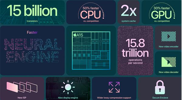 Chip A15 được trang bị CPU 64 bit, 6 lõi xử lý và được trang bị GPU 4 lõi và GPU 5 lõi cho việc xử lý đồ họa được hoàn hảo hơn. Mặc dù được trang bị bộ xử lý khủng nhưng Apple đã trang bị thêm cho chip này 4 lõi tiết kiệm năng lượng Blizzard giúp tăng thời gian sử dụng.