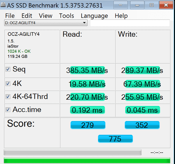 - AS SSD Benchmark cung cấp cho người dùng thông tin về tình trạng của ổ đĩa thông qua chấm điểm tổng hợp các bài kiểm tra.