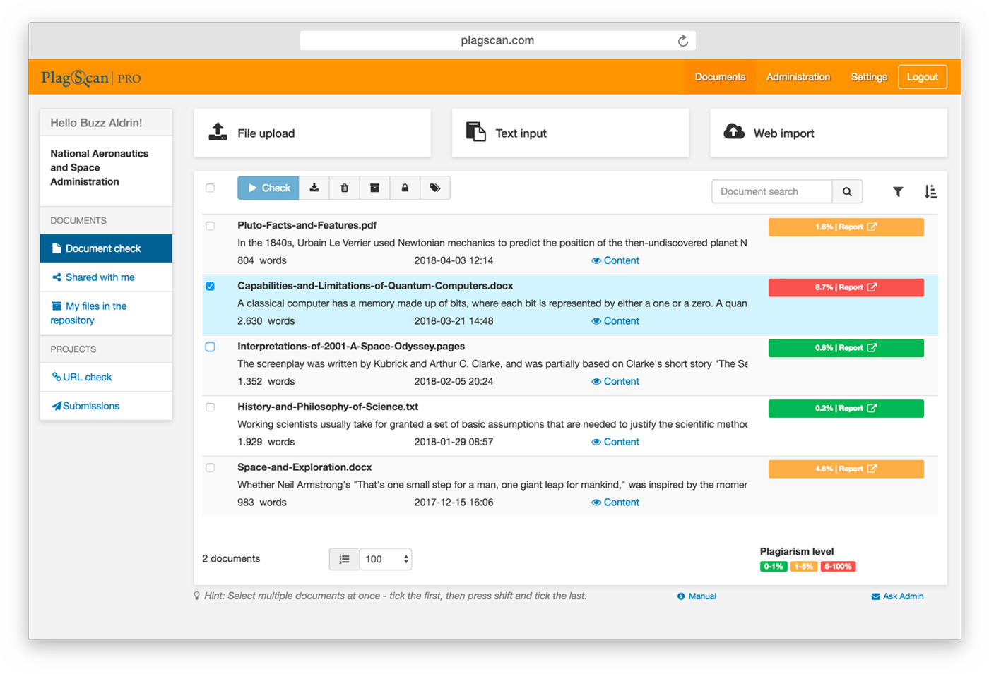 Plagscan là một dịch vụ kiểm tra đạo văn phổ biến cho các cá nhân và tổ chức. Với Plagscan, bạn có thể tải lên tài liệu từ máy tính, Dropbox hoặc Google Drive để kiểm tra độ tương đồng với các tài liệu khác.