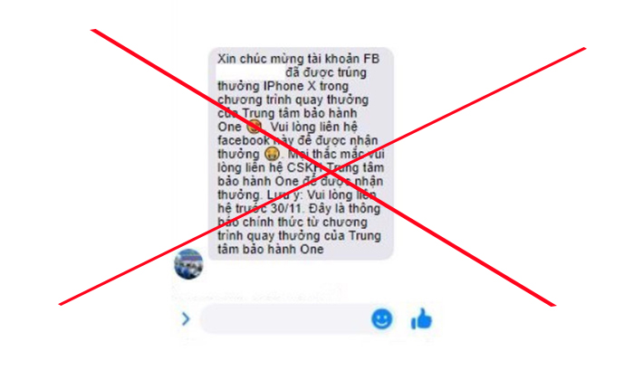 Đối tượng mạo danh thương hiệu Bảo Hành One sử dụng số điện thoại lạ gọi hoặc phát tin nhắn thông báo trúng thưởng yêu cầu khách hàng trước khi đến nhận thưởng chuyển khoản trước một khoản tiền làm phí nhận quà, đối tượng trên đã có hành vi chiếm đoạt tài sản ảnh hưởng đến lợi ích cá nhân của quý khách.