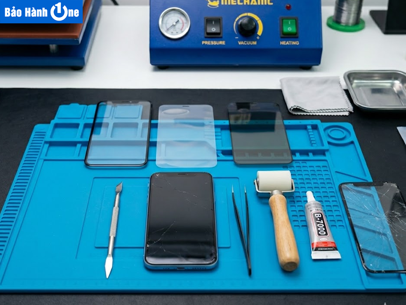 • Bước 4 – Tách kính & ép kính mới: Loại bỏ lớp kính vỡ, làm sạch keo cũ và tiến hành ép kính mới trong môi trường chân không đạt chuẩn.
