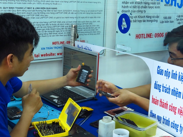 • Sau khi khách hàng mang máy tới trung tâm thì nhân viên sẽ nhận máy chuyển vào phòng kỹ thuật tiến hành kiểm tra, xem xét tình trạng hư hỏng pin của máy và báo giá dịch vụ sửa chữa.