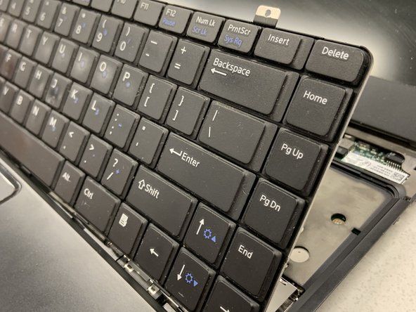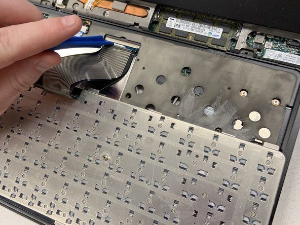 • Sử dụng một cây chổi hoặc một chiếc spudger để nhẹ nhàng bẩy bàn phím từ viền. Ngắt kết nối đầu nối ruy-băng trên bảng điều khiển.