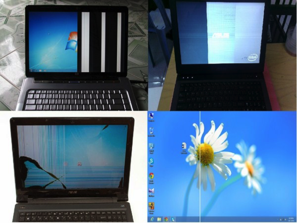 • Màn hình xuất hiện các đường kẻ ngang, dọc màu xanh, đỏ,….và không vào được window. Lúc này, có thể máy tính của bạn bị gãy hoặc hở bẹ cáp do ngoại lực tác động, bị rơi hay va đập mạnh. Bạn hãy mang máy tới trung tâm để kiểm tra xử lý sớm nhất, tránh hỏng nặng khó sửa chữa.