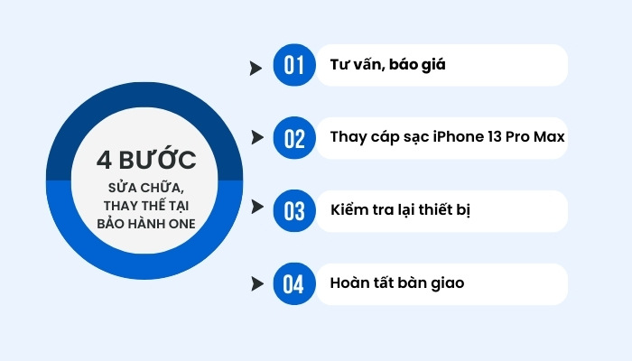 Khi đến thay cáp sạc iPhone 13 Pro Max chính hãng tại Bảo Hành One, quy trình thay thế sẽ được tiến hành như sau: