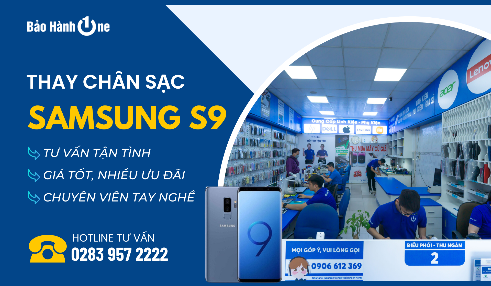Mọi thắc mắc không chỉ riêng chân sạc của điện thoại Samsung S9 mà còn sửa chữa các dòng điện thoại khác. Đừng ngần ngại liên hệ 1800.1236 (miễn phí) hoặc inbox fanpage Bảo Hành One để được hỗ trợ tư vấn nhanh chóng và chi tiết nhất.