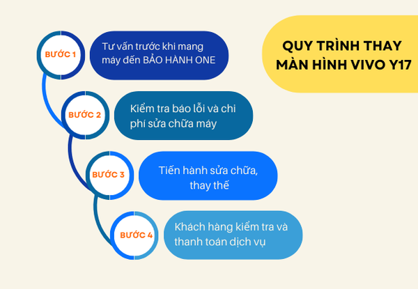 Sau khi khách hàng mang máy đến trung tâm tiếp nhận dịch vụ, bộ phận kỹ thuật sẽ tiến hành kiểm tra, xem xét tình trạng hư hỏng và báo giá dịch vụ sửa chữa thay thế cụ thể đồng thời nhân viên sẽ làm thủ tục nhận máy sửa chữa thay thế khi khách hàng đồng ý với các phương án khắc phục và báo giá của trung tâm đưa ra. Để bảo đảm quyền lợi khách hàng cần ký tên niêm phong vào toàn bộ các linh kiện trước khi nhân viên tiến hành thay màn hình cảm ứng điện thoại Vivo Y17.