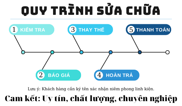 • Cuối cùng, nhân viên kỹ thuật kiểm tra toàn bộ máy và bàn giao cho bộ phận lễ tân để hoàn trả cho khách hàng. Nhân viên lễ tân viết phiếu bảo hành, dán tem mác vào máy. Khách hàng kiểm tra toàn bộ máy và tiến hành thanh toán dịch vụ sửa chữa cho trung tâm.