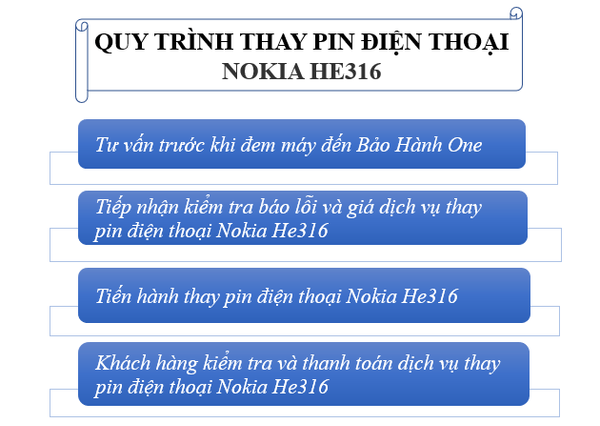 Sau khi khách hàng mang máy đến trung tâm tiếp nhận dịch vụ, bộ phận kỹ thuật sẽ tiến hành kiểm tra, xem xét tình trạng hư hỏng pin của máy và báo giá dịch vụ sửa chữa. Đồng thời nhân viên sẽ làm thủ tục nhận máy sửa chữa thay thế khi khách hàng đồng ý với các phương án khắc phục và báo giá của trung tâm đưa ra. Để bảo đảm quyền lợi khách hàng cần ký tên niêm phong vào toàn bộ các linh kiện trước khi nhân viên tiến hành thay pin điện thoại Nokia He316.