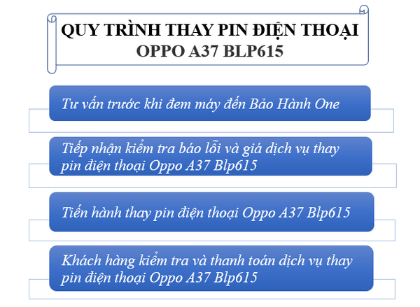 Sau khi khách hàng mang máy đến trung tâm tiếp nhận dịch vụ, bộ phận kỹ thuật sẽ tiến hành kiểm tra, xem xét tình trạng hư hỏng pin của máy và báo giá dịch vụ sửa chữa. Đồng thời nhân viên sẽ làm thủ tục nhận máy sửa chữa thay thế khi khách hàng đồng ý với các phương án khắc phục và báo giá của trung tâm đưa ra. Để bảo đảm quyền lợi khách hàng cần ký tên niêm phong vào toàn bộ các linh kiện trước khi nhân viên tiến hành thay pin điện thoại Oppo A37 Blp615.