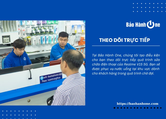 Tại Bảo Hành One, chúng tôi tạo điều kiện cho bạn theo dõi trực tiếp quá trình sửa chữa điện thoại của Realme V15 5G. Bạn sẽ được phục vụ nước uống tại khu vực dành cho khách hàng trong quá trình chờ đợi. Chúng tôi luôn tôn trọng quyền lợi của bạn nhằm đảm bảo mọi dịch vụ được thực hiện chính xác.