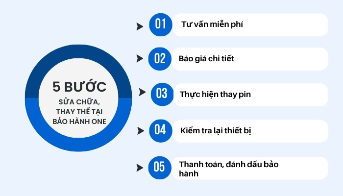 • Bước 5: Sản phẩm đã được thay pin sẽ được bàn giao lại cho bạn kiểm tra. Bảo Hành One cam kết hỗ trợ khách hàng trong suốt thời gian bảo hành, chúng tôi luôn sẵn sàng giải quyết và hỗ trợ mọi vấn đề phát sinh.