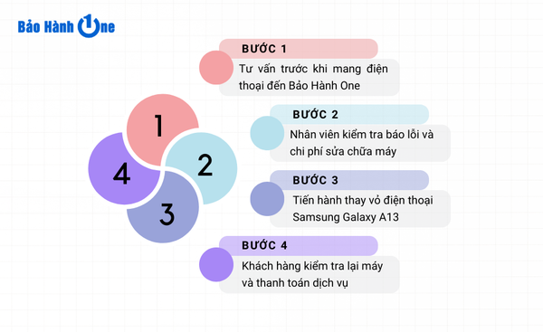 Với đội ngũ nhân viên chuyên nghiệp, đảm bảo việc thay vỏ điện thoại Samsung Galaxy A13 diễn ra nhanh chóng, không sai sót, Bảo Hành One thay vỏ theo một trình tự nhất định: